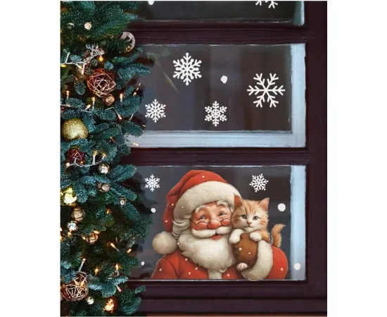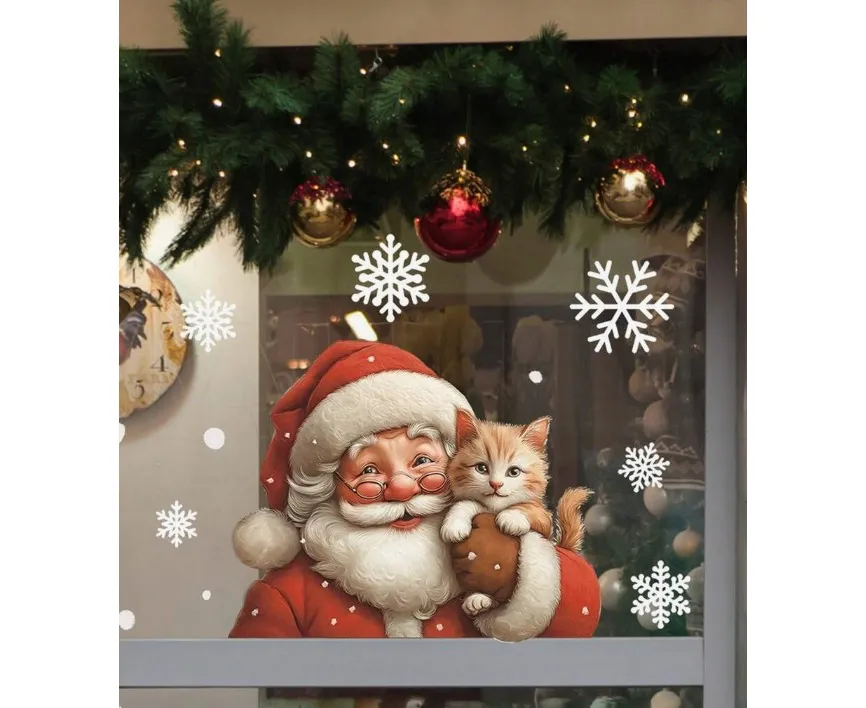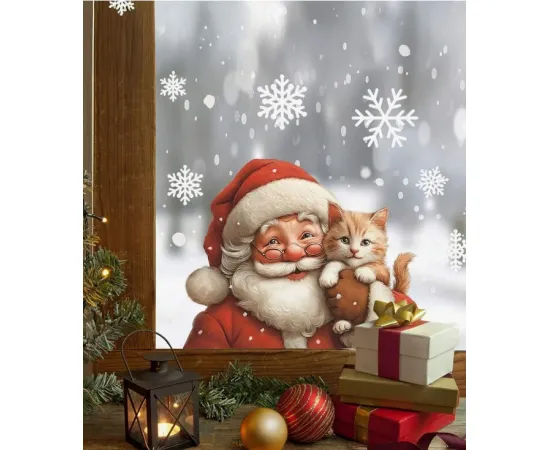Sticker/Autocolant Craciun pentru geam sau Perete - Mos Craciun cu Pisica - 11x28cm - 980893