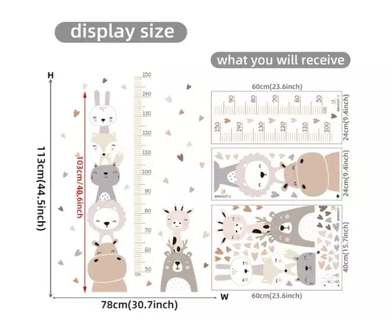 Sticker Perete Autocolant cu Centimetru pentru Copii - Inimioare si Animale