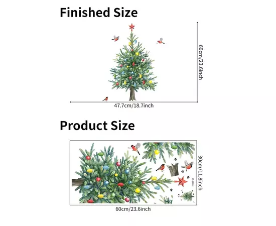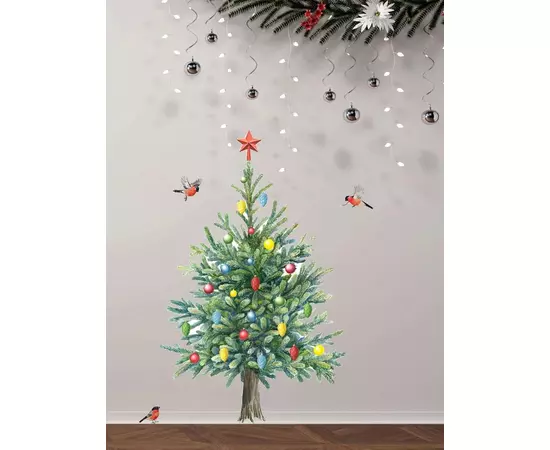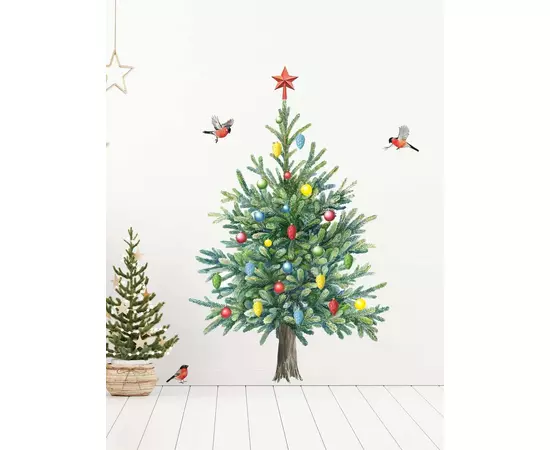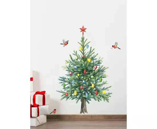 Sticker Perete Autocolant de Craciun Brad Decorat cu Globuri si Pasari 47x60cm