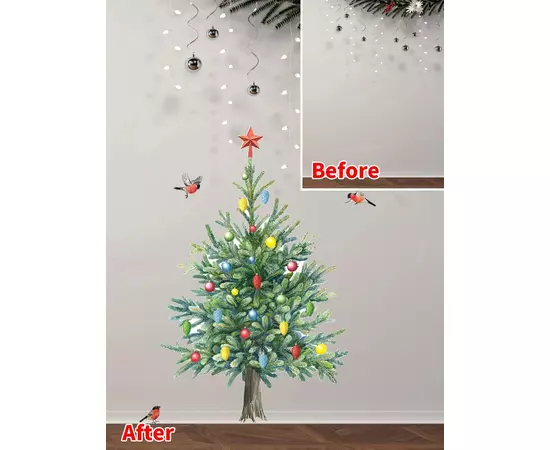 Sticker Perete Autocolant de Craciun Brad Decorat cu Globuri si Pasari