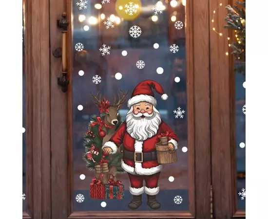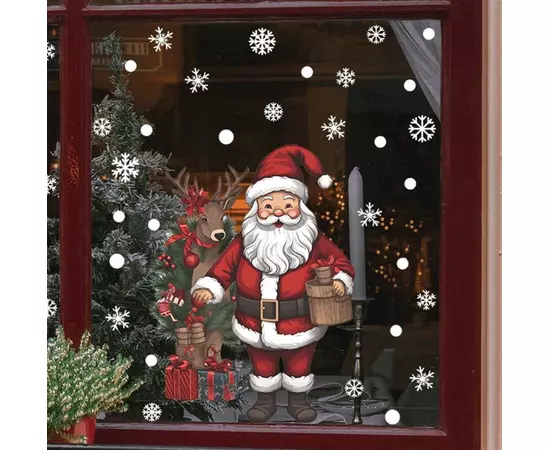 Sticker Perete Autocolant Mos Craciun, Ren, Brad si Fulgi de Nea 60x35cm, model Geam - 28758