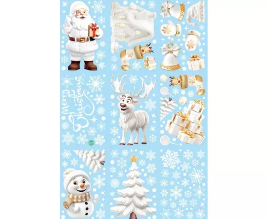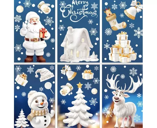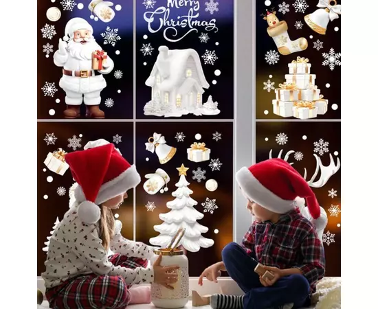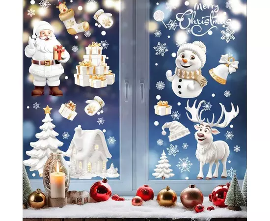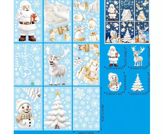 Sticker Perete Autocolant Mos Craciun, Ren, Om de Zapada, Fulgi, 9 buc, 26x18cm, model Geam - 35003