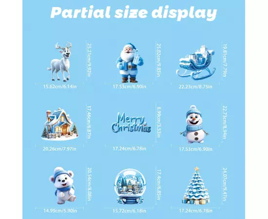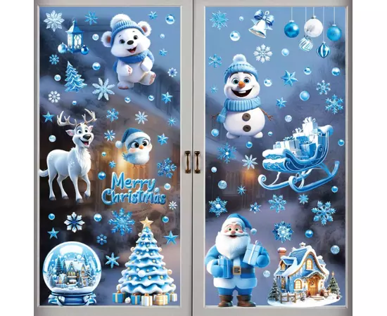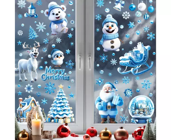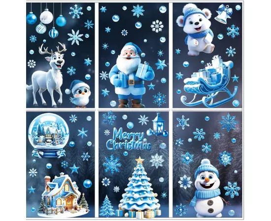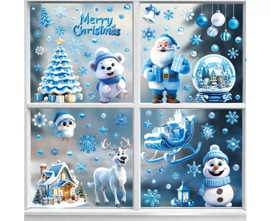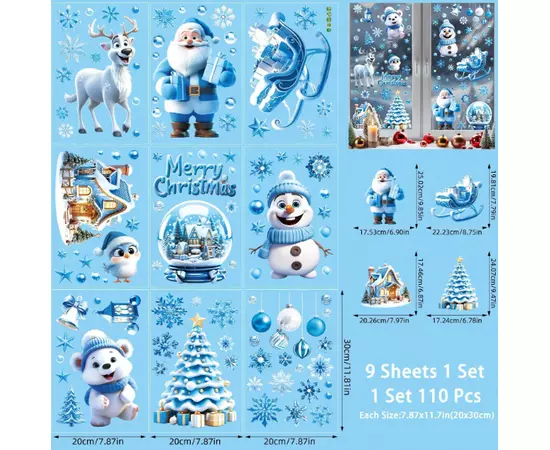 Sticker Perete Autocolant Mos Craciun, Sanie, Ren si Om de Zapada, 9 buc, 30x20cm, model Geam - 39351