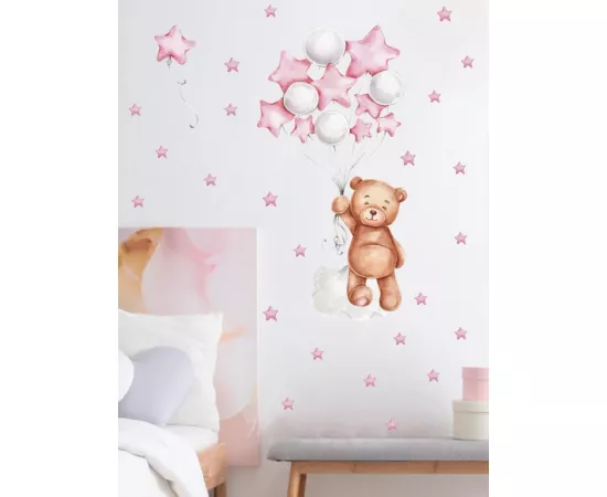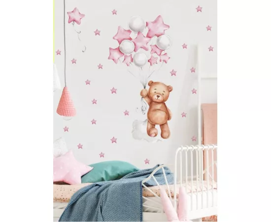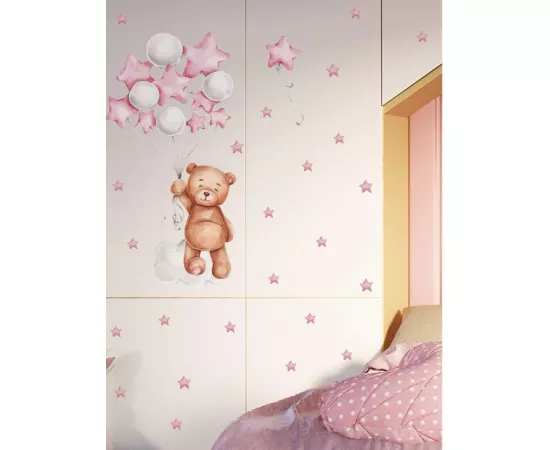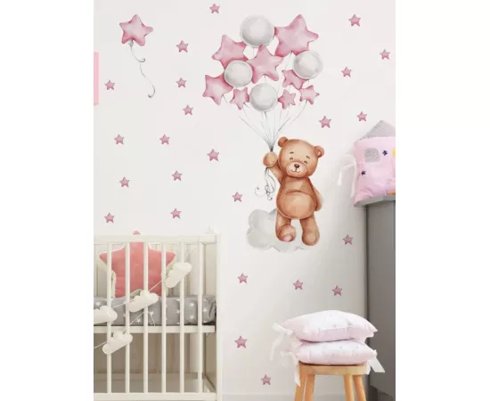 Sticker Perete Autocolant Ursulet, Baloane si Stelute Roz