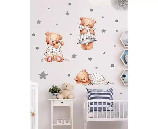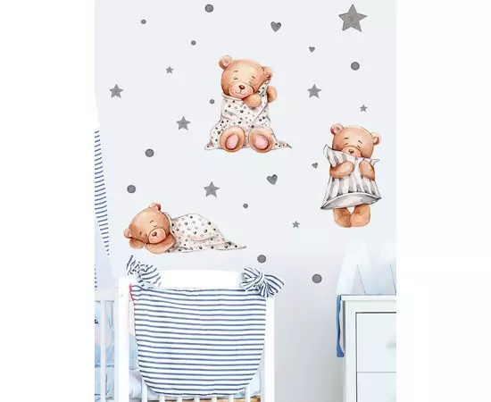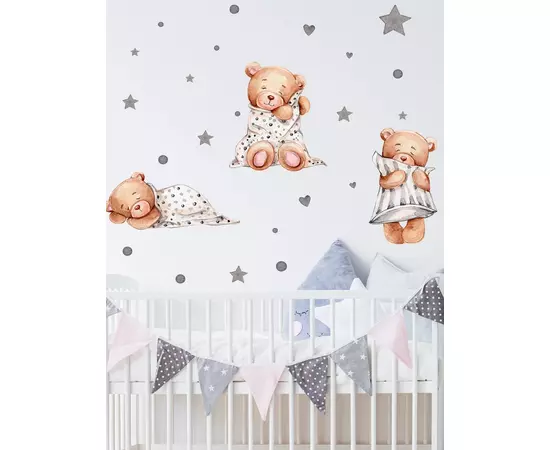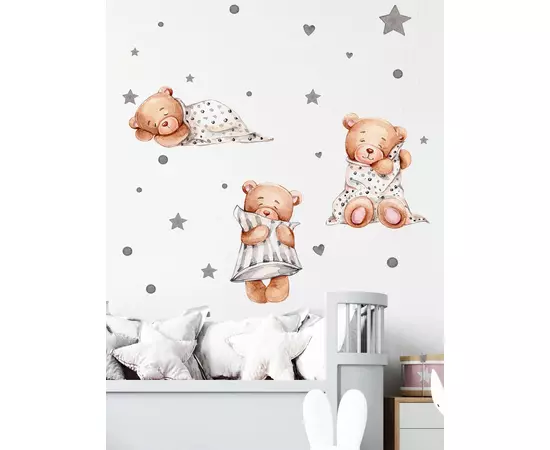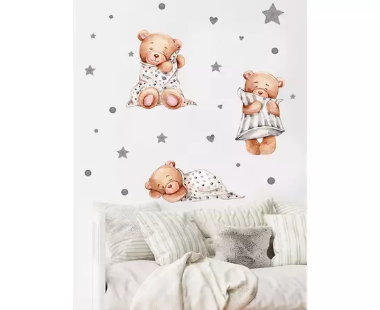 Sticker Perete Autocolant Trei Ursuleti Inveliti cu Lenjerii Dorm