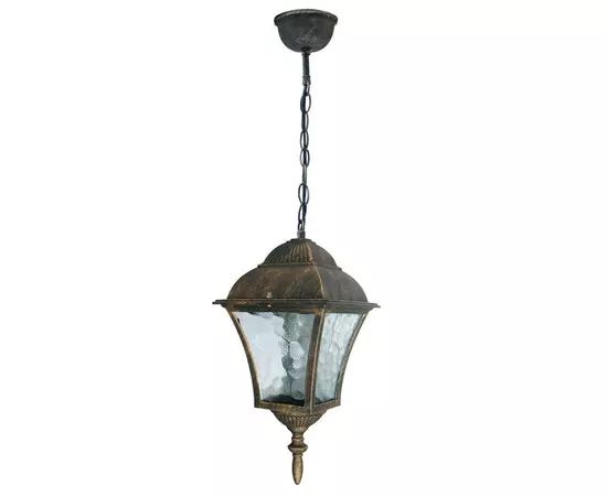 Suspensia este un corp de iluminat suspendat, ce se utilizeaza la exterior. Structura este confectionata din metal de culoare aur antic, iar abajurul este realizat din sticla transparenta.