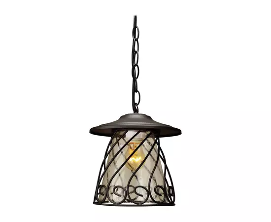 Suspensia este un corp de iluminat pentru exterior cu structura metalica de culoare negru rustic si dispersor din sticla transparenta.