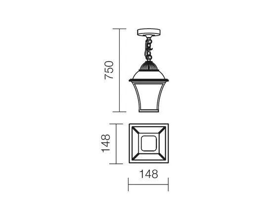 Corpul de iluminat pentru exterior tip suspensie este prevazut cu un corp din aluminiu turnat sub presiune, vopsit in camp electrostatic maro si dispersor din sticla ornamentala cu efect de bule de aer.