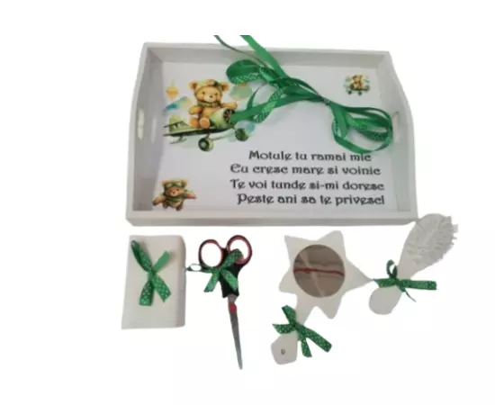 Taierea motului/ Turta este o traditie frumoasa si îndrăgita la noi în țară și practicat în mai toate familiile, reprezentând un prilej de bucurie și sărbătoare. Va propunem un set complet care imbina toate elementele de care nasii si parintii bebelusului au nevoie pentru taierea motului.