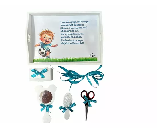 Taierea motului/ Turta este o traditie frumoasa si îndrăgita la noi în țară și practicat în mai toate familiile, reprezentând un prilej de bucurie și sărbătoare. Va propunem un set complet care imbina toate elementele de care nasii si parintii bebelusului au nevoie pentru taierea motului.