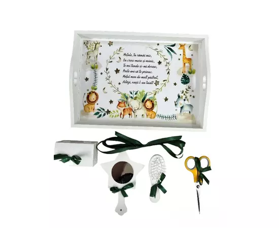 Taierea motului/ Turta este o traditie frumoasa si îndrăgita la noi în țară și practicat în mai toate familiile, reprezentând un prilej de bucurie și sărbătoare. Va propunem un set complet care imbina toate elementele de care nasii si parintii bebelusului au nevoie pentru taierea motului.