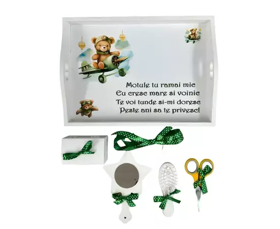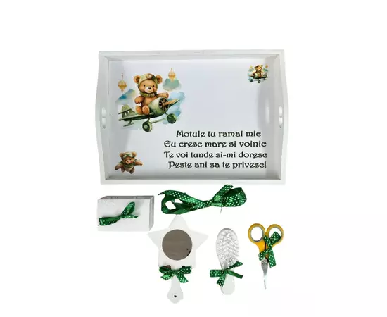 Taierea motului/ Turta este o traditie frumoasa si îndrăgita la noi în țară și practicat în mai toate familiile, reprezentând un prilej de bucurie și sărbătoare. Va propunem un set complet care imbina toate elementele de care nasii si parintii bebelusului au nevoie pentru taierea motului.
