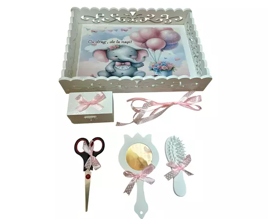 Taierea motului/ Turta este o traditie frumoasa si îndrăgita la noi în țară și practicat în mai toate familiile, reprezentând un prilej de bucurie și sărbătoare. Va propunem un set complet care imbina toate elementele de care nasii si parintii bebelusului au nevoie pentru taierea motului.