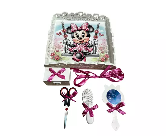 Tavita Turta cu 6 Piese - Minnie in Leagan - TPT71 Alb cu Roz