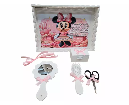 Taierea motului/ Turta este o traditie frumoasa si îndrăgita la noi în țară și practicat în mai toate familiile, reprezentând un prilej de bucurie și sărbătoare. Va propunem un set complet care imbina toate elementele de care nasii si parintii bebelusului au nevoie pentru taierea motului.