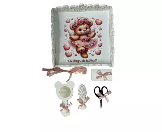 Tavita Turta cu 6 Piese - Ursulet si Inimioare - TPT61 Alb cu Roz Pudra