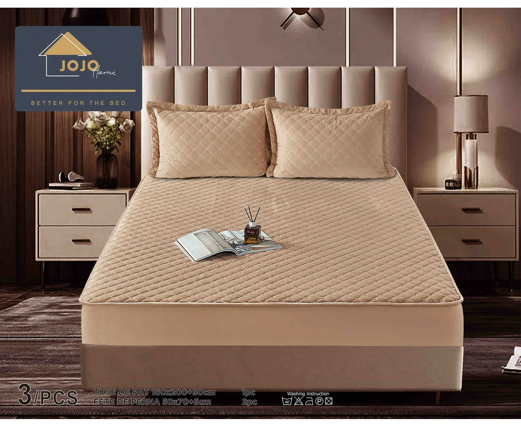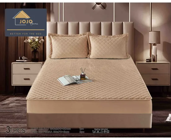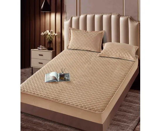 Topper Saltea/Husa de pat matlasata si 2 fete de perne din catifea, cu elastic, model tip topper 160x200 - JO845