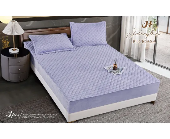Topper Saltea/Husa de pat matlasata si 2 fete de perne din catifea, cu elastic, model tip topper 160x200 - SPR519