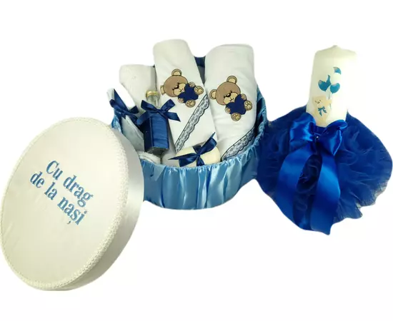 Pentru ca botezul este un eveniment important pentru parinti si nasi, venim in ajutor cu un set care contine toate cele necesare pentru crestinarea bebelusului