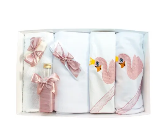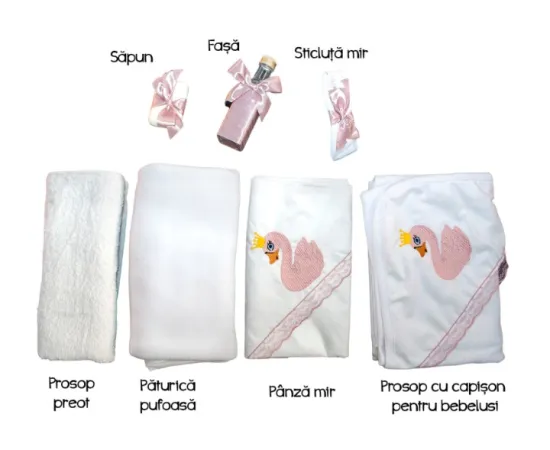 Trusou Botez 7 Piese cu Text Imprimat, Alb-Roz, Lebada - TB37