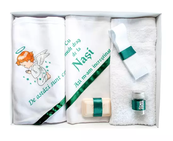 Trusou Botez, 6 Piese cu Text Imprimat "Azi m-am crestinat", Verde, Inger - TB178