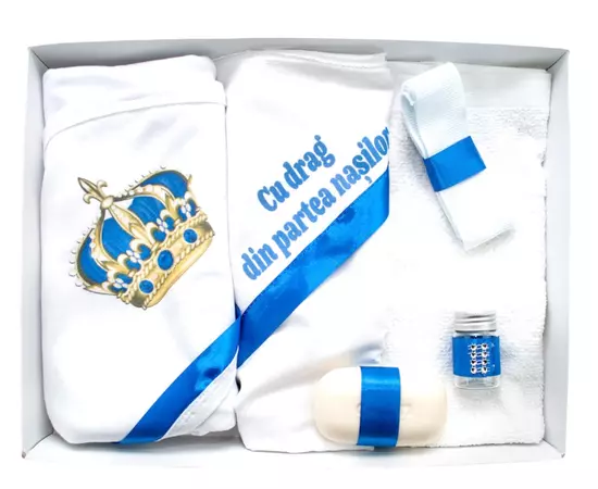 Pentru ca botezul este un eveniment important pentru parinti si nasi, venim in ajutor cu un set care contine toate cele necesare pentru crestinarea bebelusului