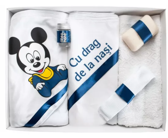 Trusou Botez 6 piese cu text imprimat "Mickey Mouse" ALB - BLEUMARIN - TB101