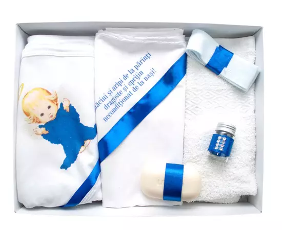 Pentru ca botezul este un eveniment important pentru parinti si nasi, venim in ajutor cu un set care contine toate cele necesare pentru crestinarea bebelusului