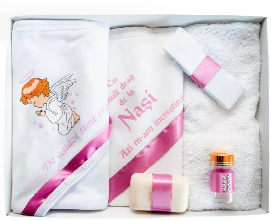 Pentru ca botezul este un eveniment important pentru parinti si nasi, venim in ajutor cu un set care contine toate cele necesare pentru crestinarea bebelusului