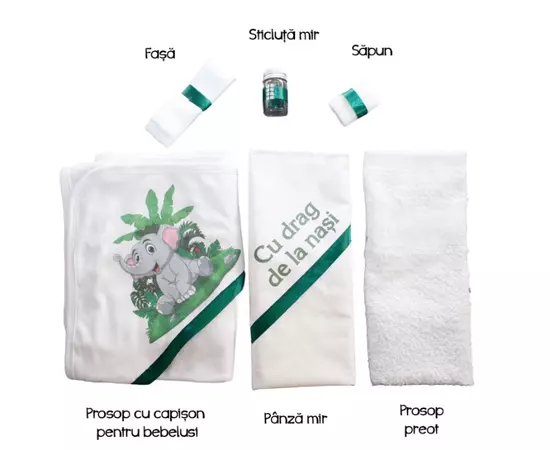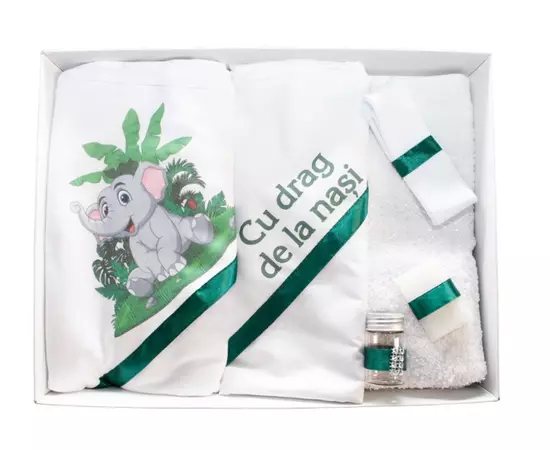 Trusou Botez 6 Piese cu Text Imprimat, Verde, Elefant - TB35