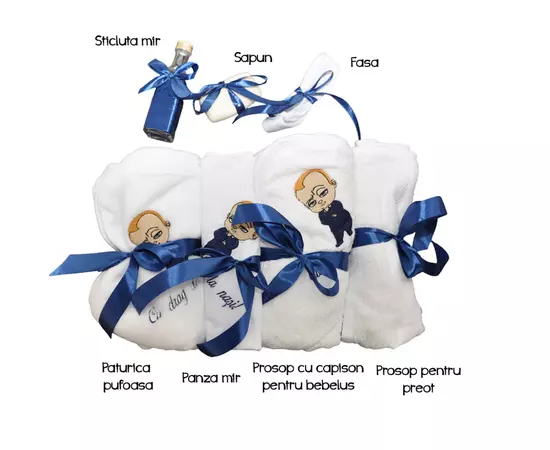 - Prosop pentru bebelus – din material moale deosebit de absorbant,din bumbac de cea mai buna calitate. Prosopul este decorat cu dantela si cu diferite mesaje. Dimensiunea prosopului este de 80 cm x 80 cm, suficient pentru a sterge bebelusul si pentru a-l tine infasurat pe parcursul ceremoniei;