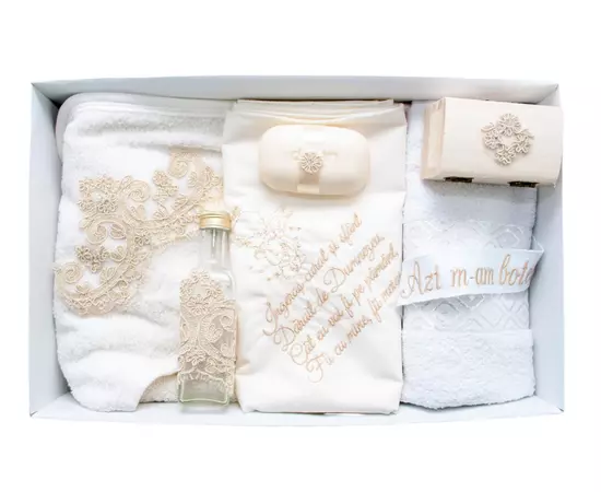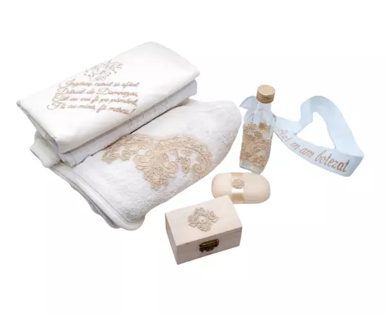 Pentru ca botezul este un eveniment important pentru parinti si nasi, venim in ajutor cu un set care contine toate cele necesare pentru crestinarea bebelusului