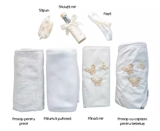 Pentru ca botezul este un eveniment important pentru parinti si nasi, venim in ajutor cu un set care contine toate cele necesare pentru crestinarea bebelusului
