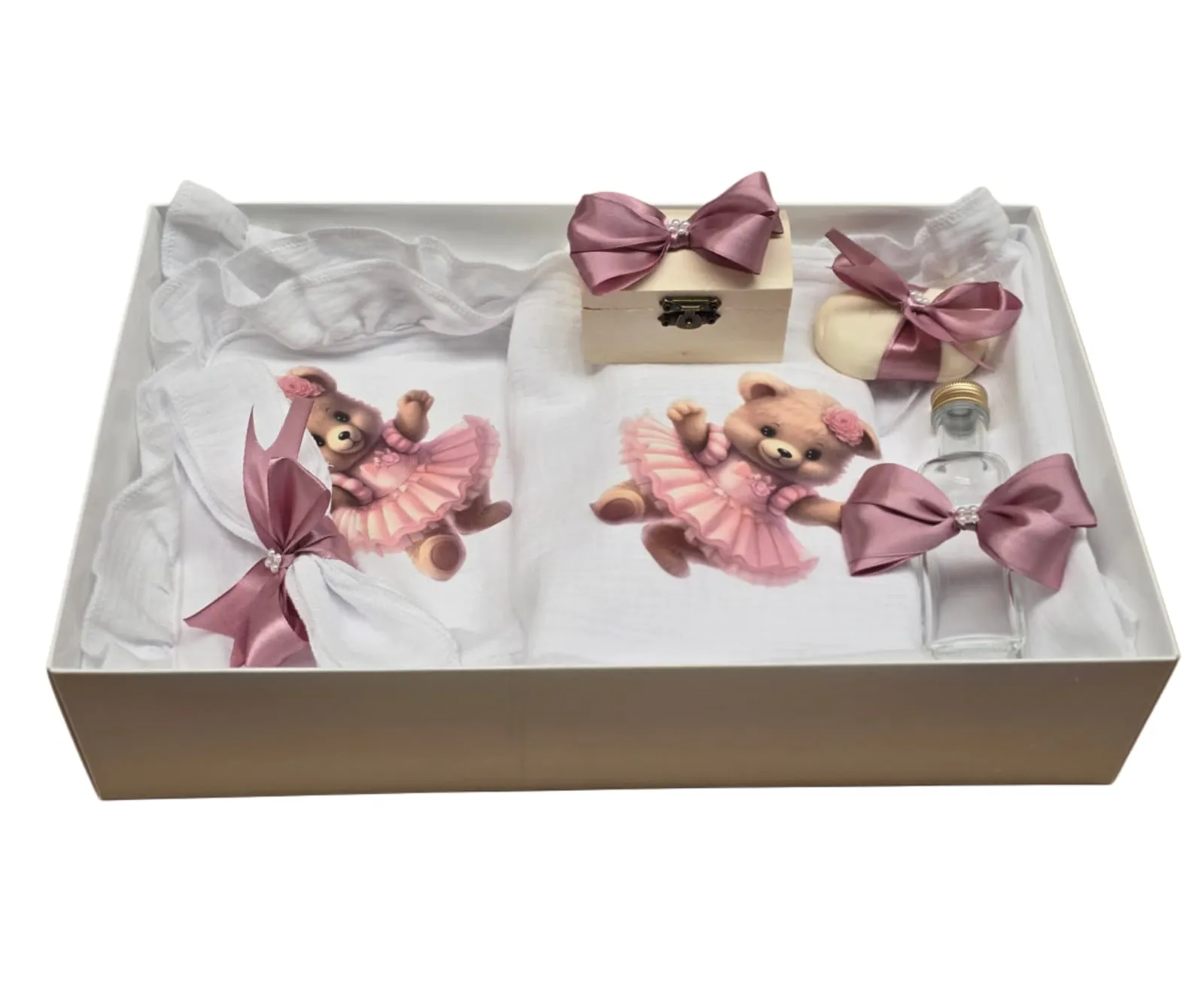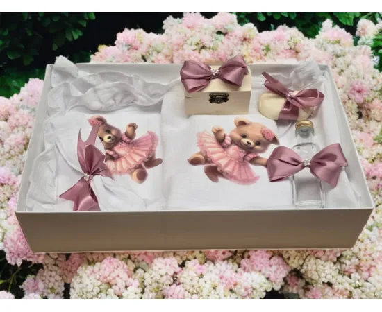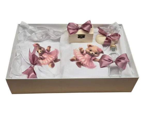 Trusou Botez, 7 Piese, Muselina, Fetita Ursulet, Alb - TB305