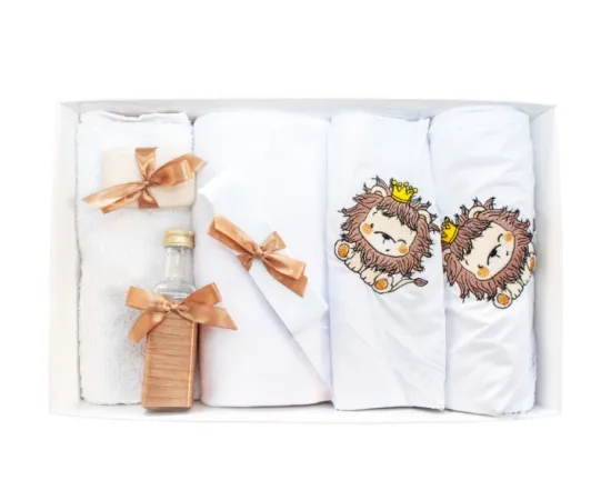 Trusou Botez 7 Piese Personalizat cu Broderie, Alb-Maro, Leu- TB41