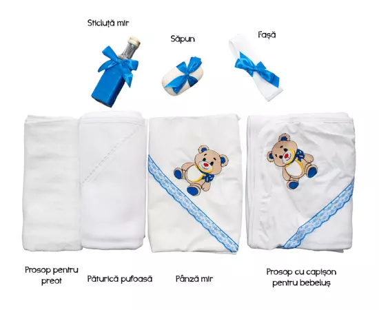 Pentru ca botezul este un eveniment important pentru parinti si nasi, venim in ajutor cu un set care contine toate cele necesare pentru crestinarea bebelusului