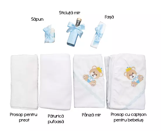 Pentru ca botezul este un eveniment important pentru parinti si nasi, venim in ajutor cu un set care contine toate cele necesare pentru crestinarea bebelusului
