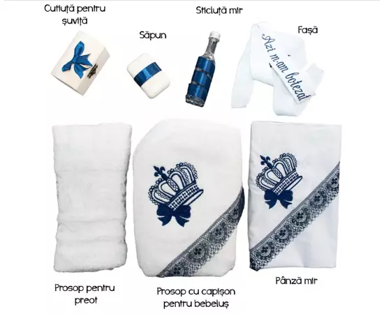 Pentru ca botezul este un eveniment important pentru parinti si nasi, venim in ajutor cu un set care contine toate cele necesare pentru crestinarea bebelusului
