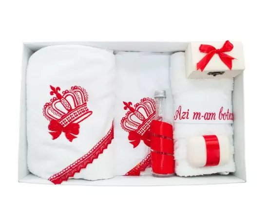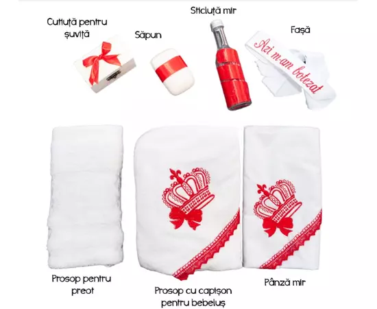Trusou Botez 7 Piese Personalizat cu Broderie, Rosu, Coroana Regala - TB125
