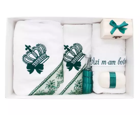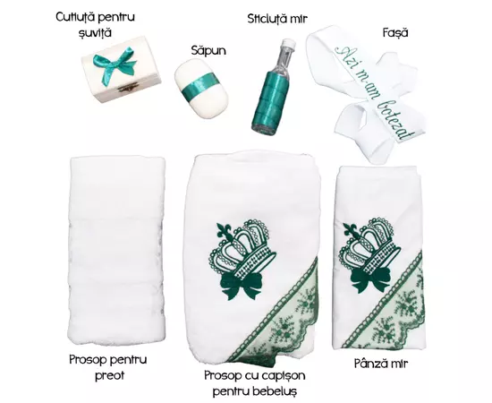 Trusou Botez 7 Piese Personalizat cu Broderie, Verde, Coroana Regala - TB49