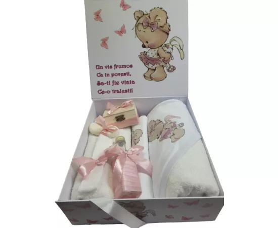 Trusou Botez cu 8 Piese, Ursulet cu Iepuras, Culoare Roz - TB03