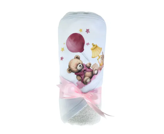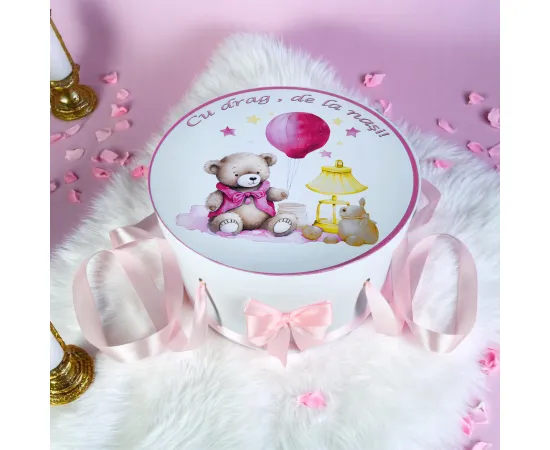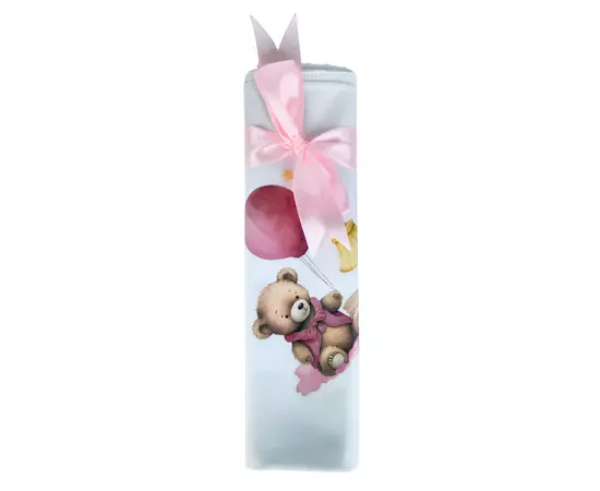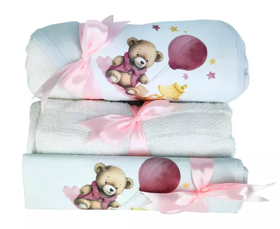Trusou Botez cu 8 Piese Imprimat, Ursulet cu Balon, Culoare Roz Perlat - BAB185
