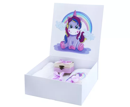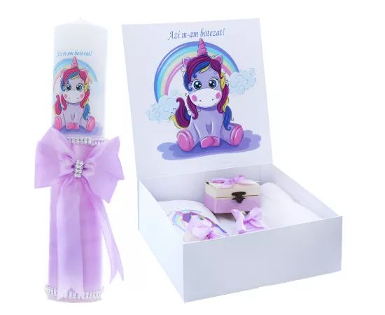 Set Cutie Trusou cu Lumanare, 9 Piese, "Cu drag de la nasi", Lila, Unicorn - TB183