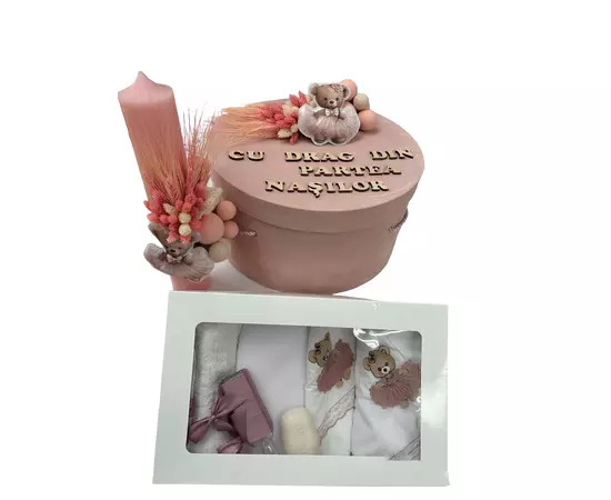 - Toate aceste elemente sunt prezentate într-un ambalaj elegant, potrivit pentru a fi oferit ca un cadou special, semn al bucuriei și recunoștinței față de acest moment deosebit din viața familiei.