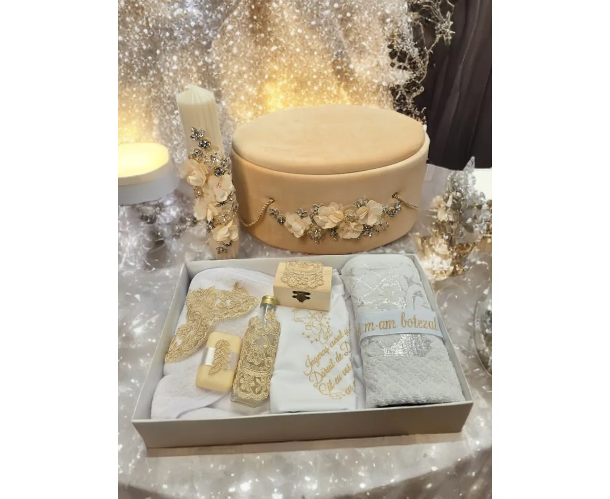 Deoarece botezul este un eveniment important pentru parinti si nasi, venim in ajutor cu un set care contine toate cele necesare pentru crestinarea bebelusului