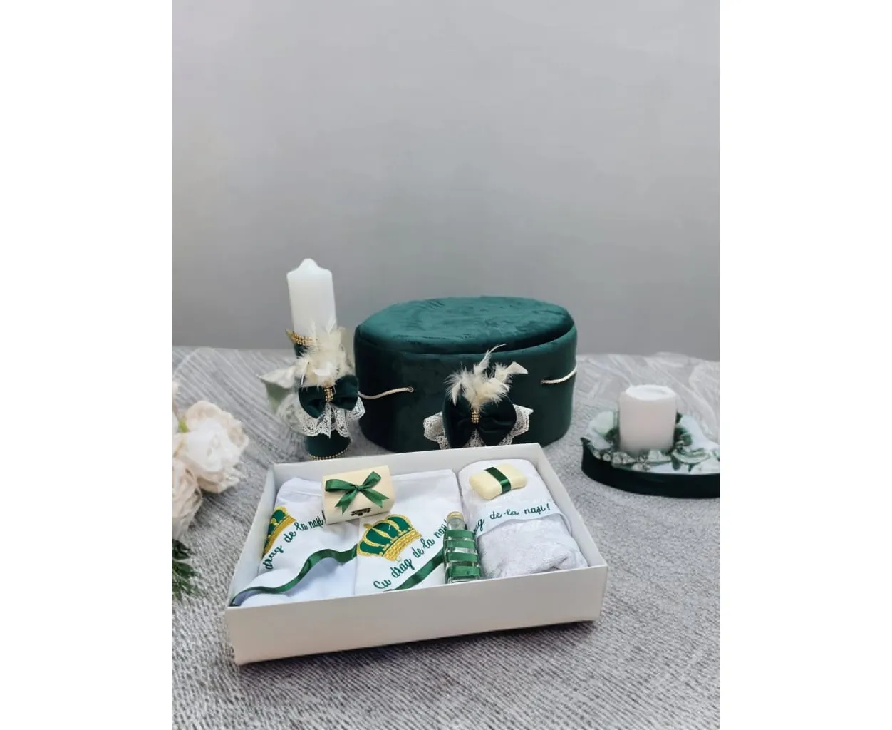 Trusou Botez cu 7 Piese + Cutie Catifea + Lumanare - Verde - TB911