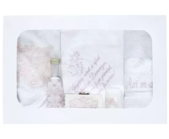 Trusou botez cu 7 piese personalizat cu broderie - "Azi m-am botezat" - ALB- ROZ - TB57