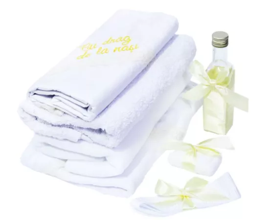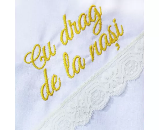 Trusou Botez cu 7 piese personalizat cu broderie - "Cu drag de la Nasi" - ALB - GALBEN- TB95