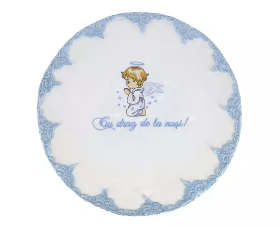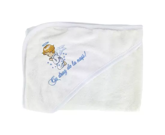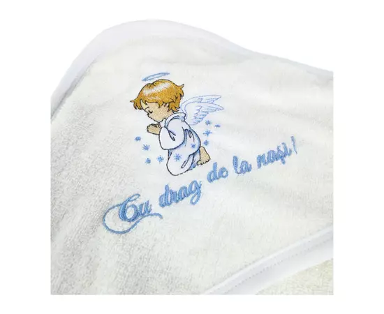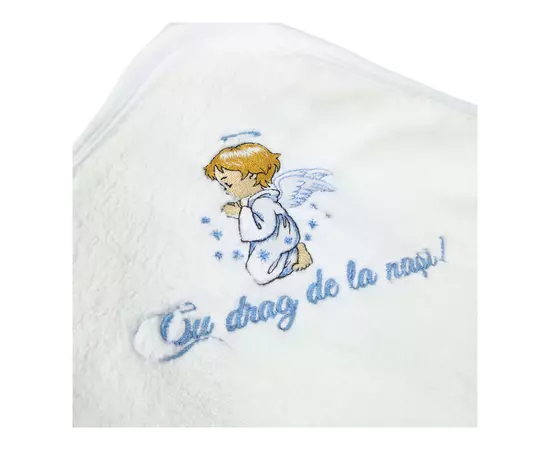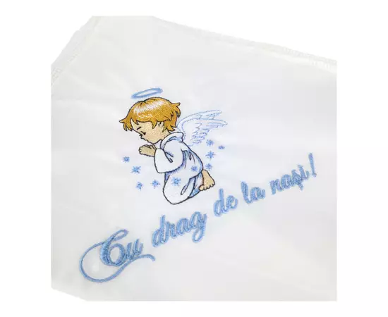 - Prosop pentru bebelus – din material moale deosebit de absorbant,din bumbac de cea mai buna calitate. Prosopul este decorat cu dantela si cu diferite mesaje. Dimensiunea prosopului este de 80 cm x 80 cm, suficient pentru a sterge bebelusul si pentru a-l tine infasurat pe parcursul ceremoniei;