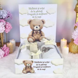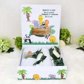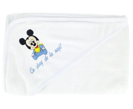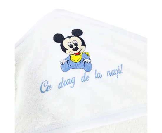 - Prosop pentru bebelus – din material moale deosebit de absorbant,din bumbac de cea mai buna calitate. Prosopul este decorat cu dantela si cu diferite mesaje. Dimensiunea prosopului este de 80 cm x 80 cm, suficient pentru a sterge bebelusul si pentru a-l tine infasurat pe parcursul ceremoniei;